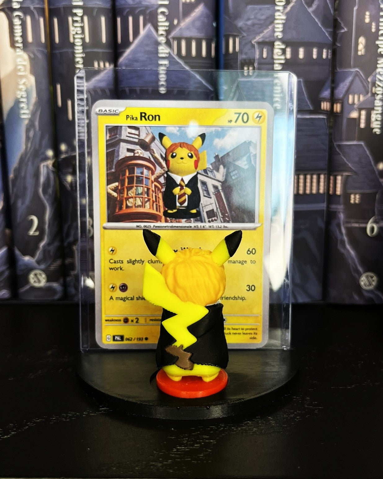 PikaRon indossa la toga di Grifondoro e sfoggia la sua inconfondibile chioma rossiccia, simbolo di amicizia e determinazione. Ogni pezzo è accompagnato da una carta in stile Pokémon, ideata e creata a mano, e da una base d’appoggio per esposizione.